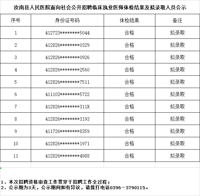 汝南縣人民醫(yī)院面向社會公開招聘臨床執(zhí)業(yè)醫(yī)師體檢結(jié)果及擬錄取人員公示