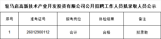 駐馬店高新技術產業開發投資有限公司公開招聘工作人員擬錄取人員公示