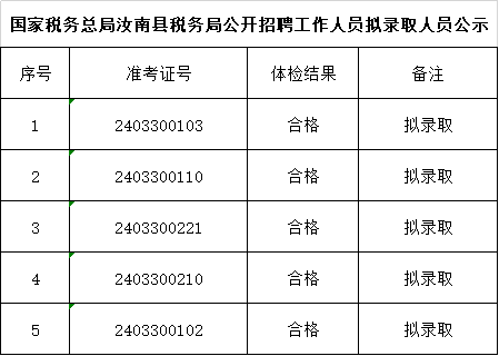 國家稅務總局汝南縣稅務局公開招聘工作人員擬錄取人員公示