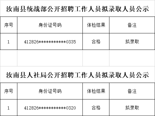 汝南縣統戰部、人社局公開招聘工作人員擬錄取人員公示