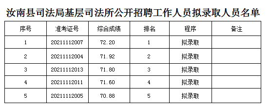 汝南縣司法局基層司法所公開招聘工作人員擬錄取人員名單
