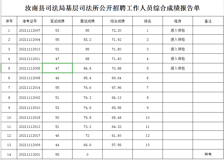 汝南縣司法局基層司法所公開招聘工作人員綜合成績報告單