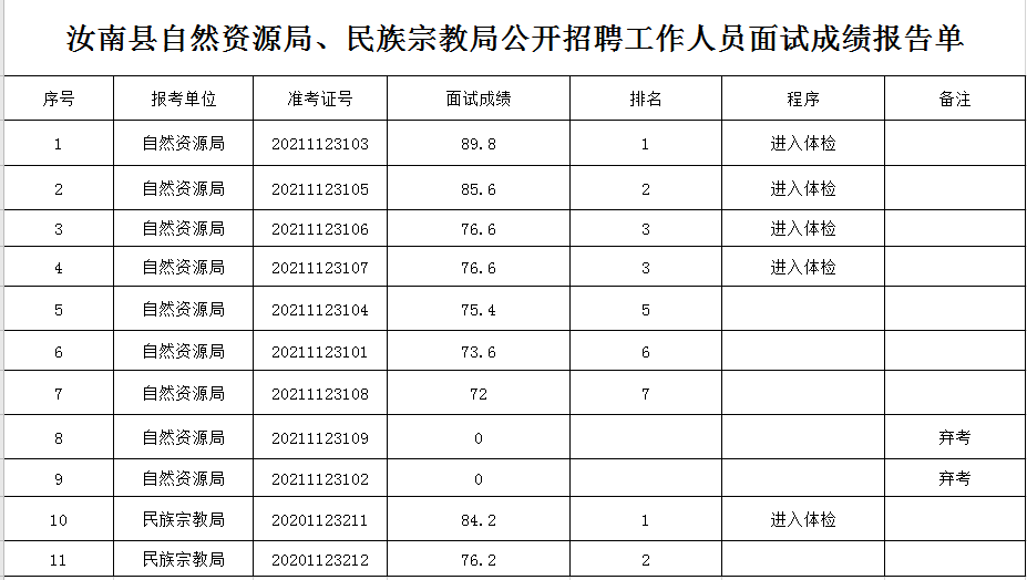 汝南縣自然資源局、民族宗教局公開招聘工作人員面試成績報告單